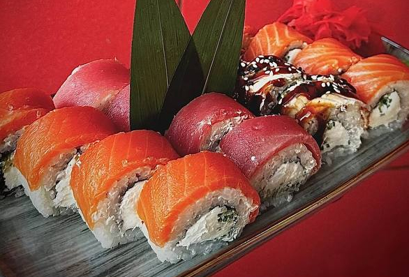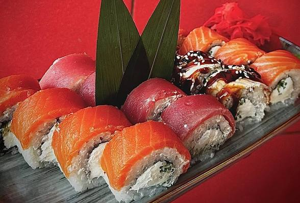 Крем сыр, авокадо, креветки, манго чили, сфера из двух сырок, лосося, кимчи, унаги