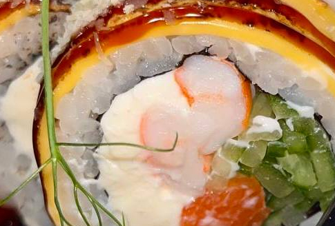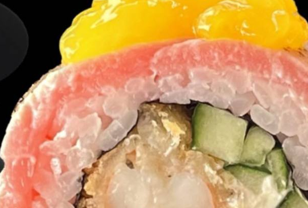Опаленный тунец, крем сыр, огурец, креветка панко, соус манго