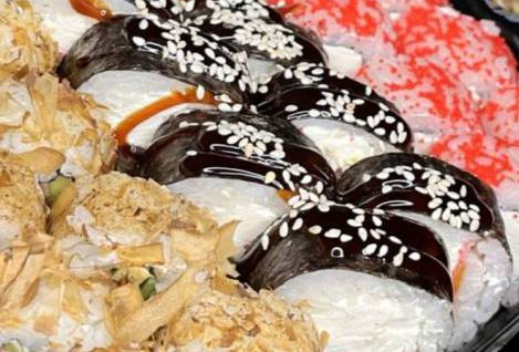 Лосось, угорь, краб, креветка, икра тобико, крем сыр, огурец, авокадо, соус Унаги, кунжут