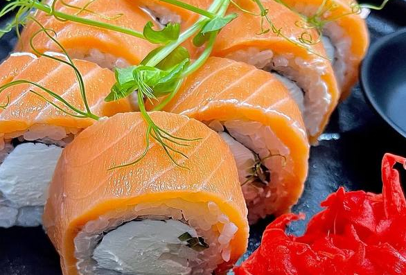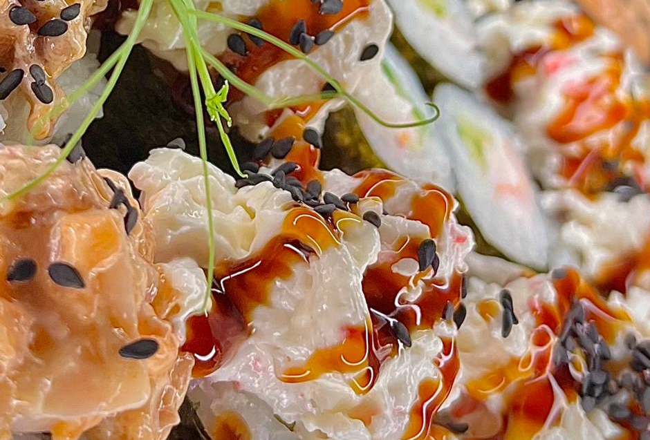 Опаленный лосось, крем сыр, огурец, краб, икра тобико, соус Спайс